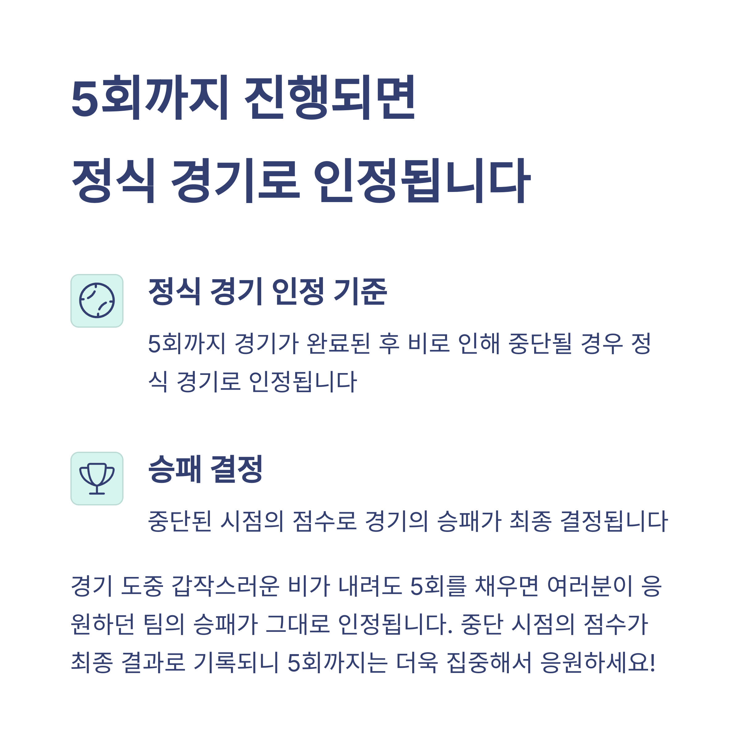 - 5회까지 경기 진행 시 ‘정식 경기’로 인정