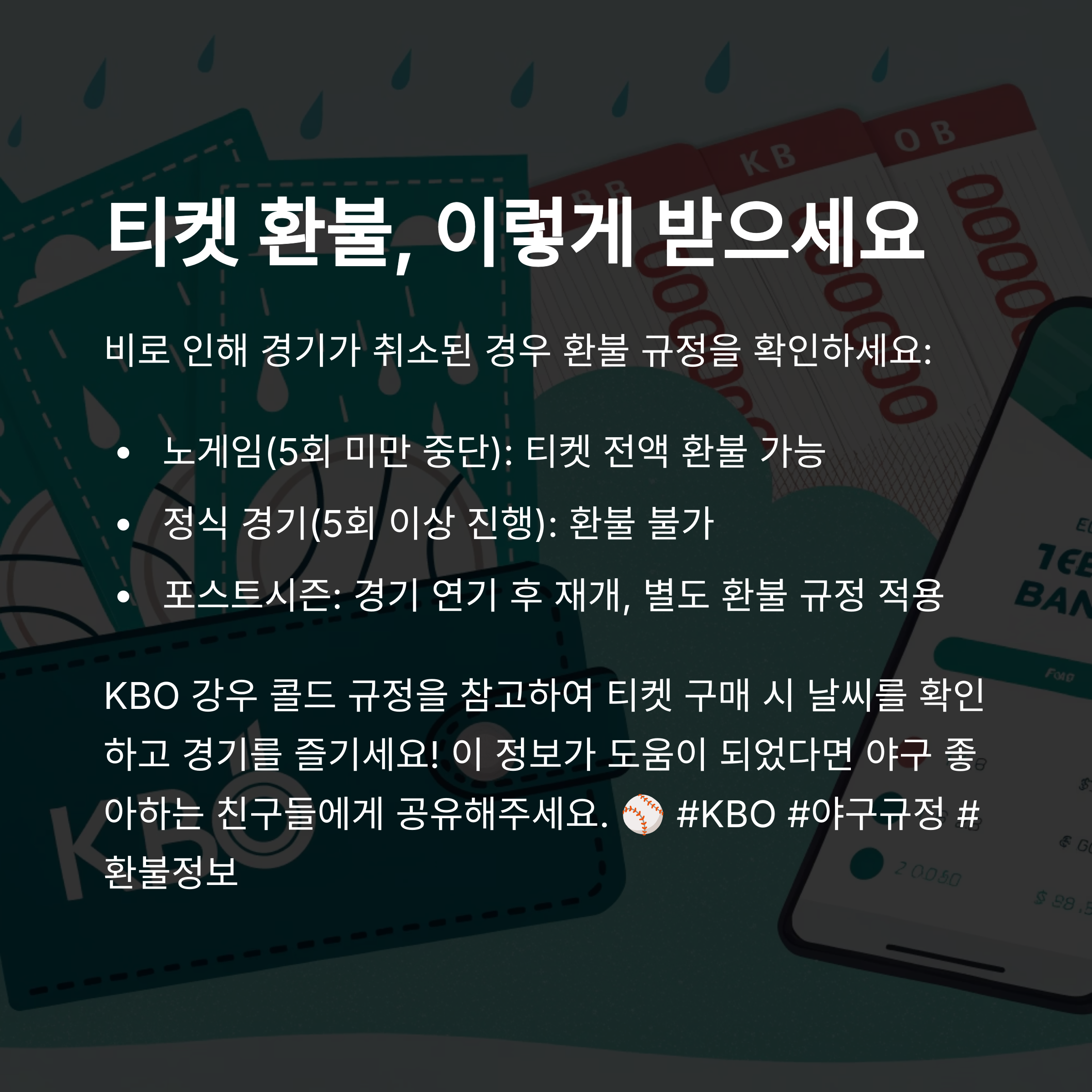 | 콜드게임 (5회 이후 종료) | 환불 불가 (정식 경기로 간주) |