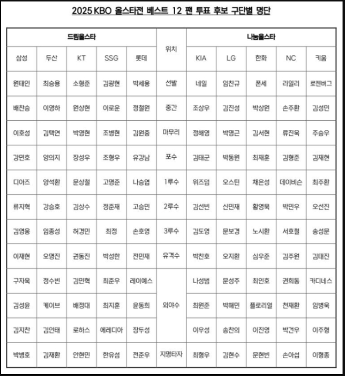 이번 팬투표에 오른 10개 구단 소속 120명의 후보 선수들은 포지션별로 고르게 분포되어 있어요.