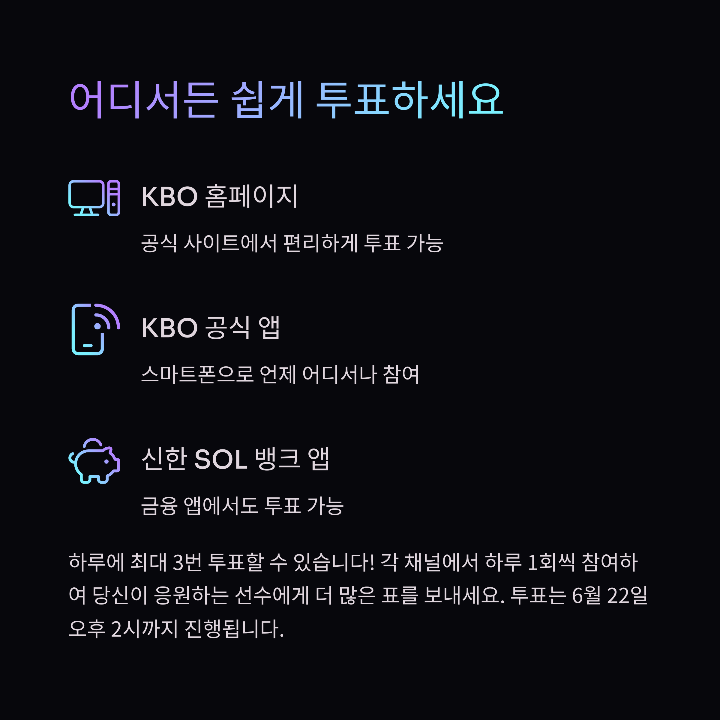 | 참여 방식 | KBO 홈페이지, KBO 앱, 신한 SOL뱅크 앱 (하루 3회 참여 가능) |