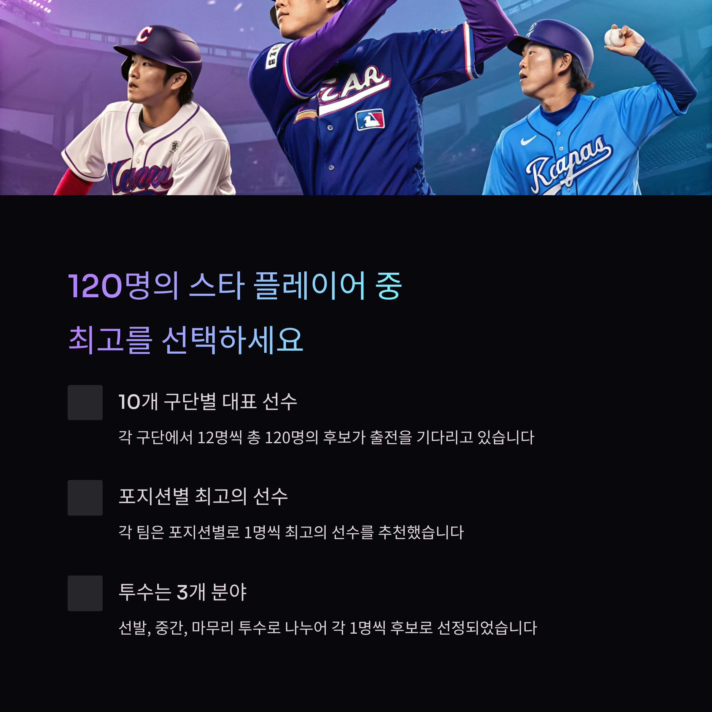 이번 팬투표에 오른 10개 구단 소속 120명의 후보 선수들은 포지션별로 고르게 분포되어 있어요.