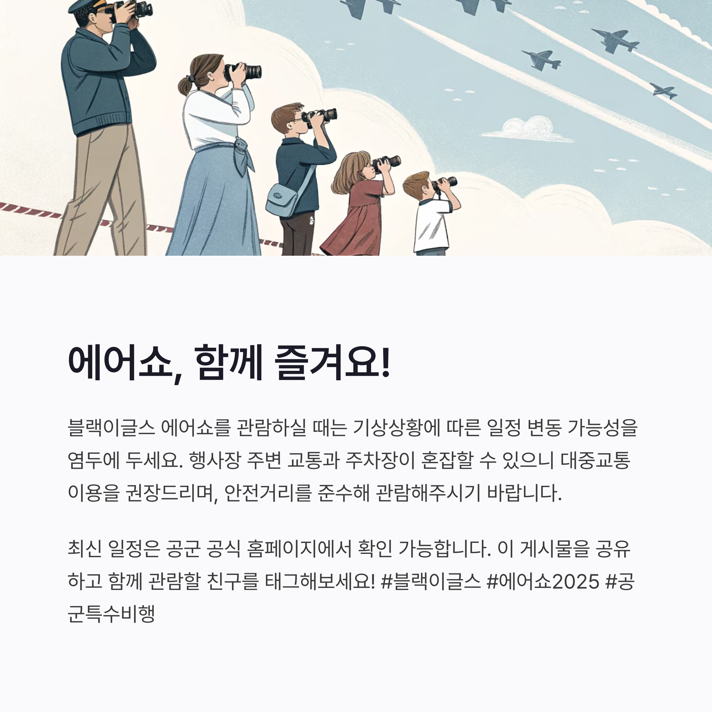 안녕하세요! 하늘을 가르는 감동, 블랙이글스의 에어쇼가 드디어 돌아왔습니다. 2025년 4월, 전국 여러 도시에서 공군 특수비행팀 ‘블랙이글스’의 비행을 가까이에서 볼 수 있는 기회가 찾아왔는데요. 직접 본 분들은 아시겠지만, 하늘을 가로지르는 연기 궤적과 굉음은 말로 설명할 수 없는 감동이 있습니다. 이번 포스팅에서는 2025 블랙이글스 에어쇼 일정과 관람 꿀팁을 한눈에 보기 좋게 정리해드릴게요. 나들이, 가족 행사로도 추천드려요!