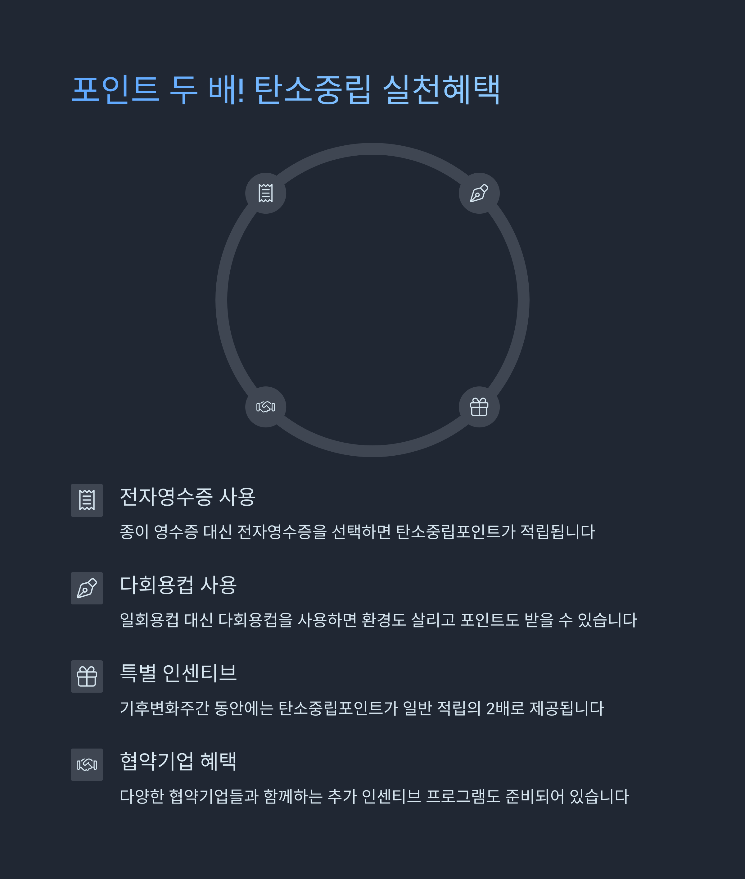 - 적립 항목: 전자영수증, 대중교통 이용, 다회용기, 무포장 상품 사용 등