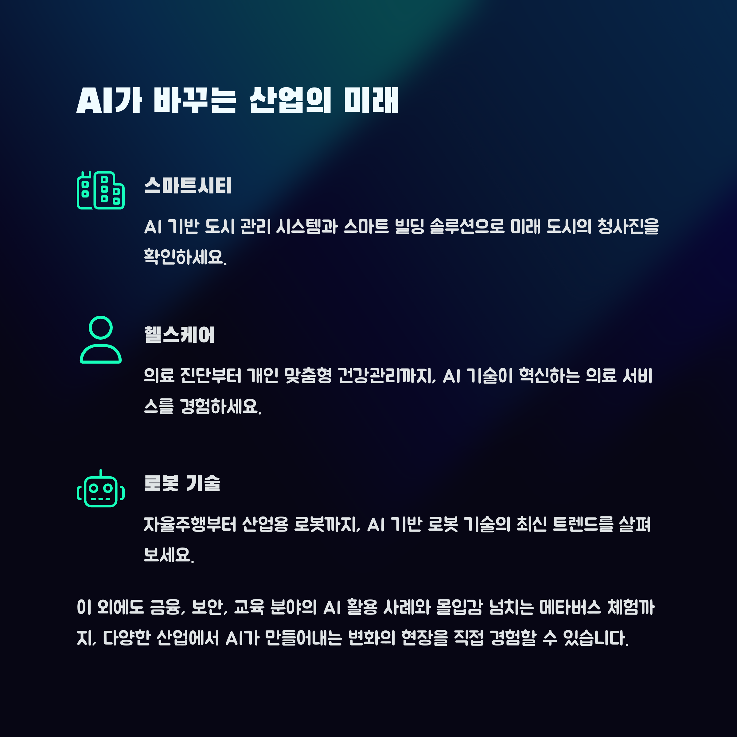 이 외에도 스마트팜, 금융 AI, 보안, 미디어, 교육 등 다양한 산업군과 연결된 AI 기술들이 전시될 예정입니다. 각 분야별 시연 부스와 체험 공간도 운영돼 현장에서 기술을 직접 체감할 수 있습니다.