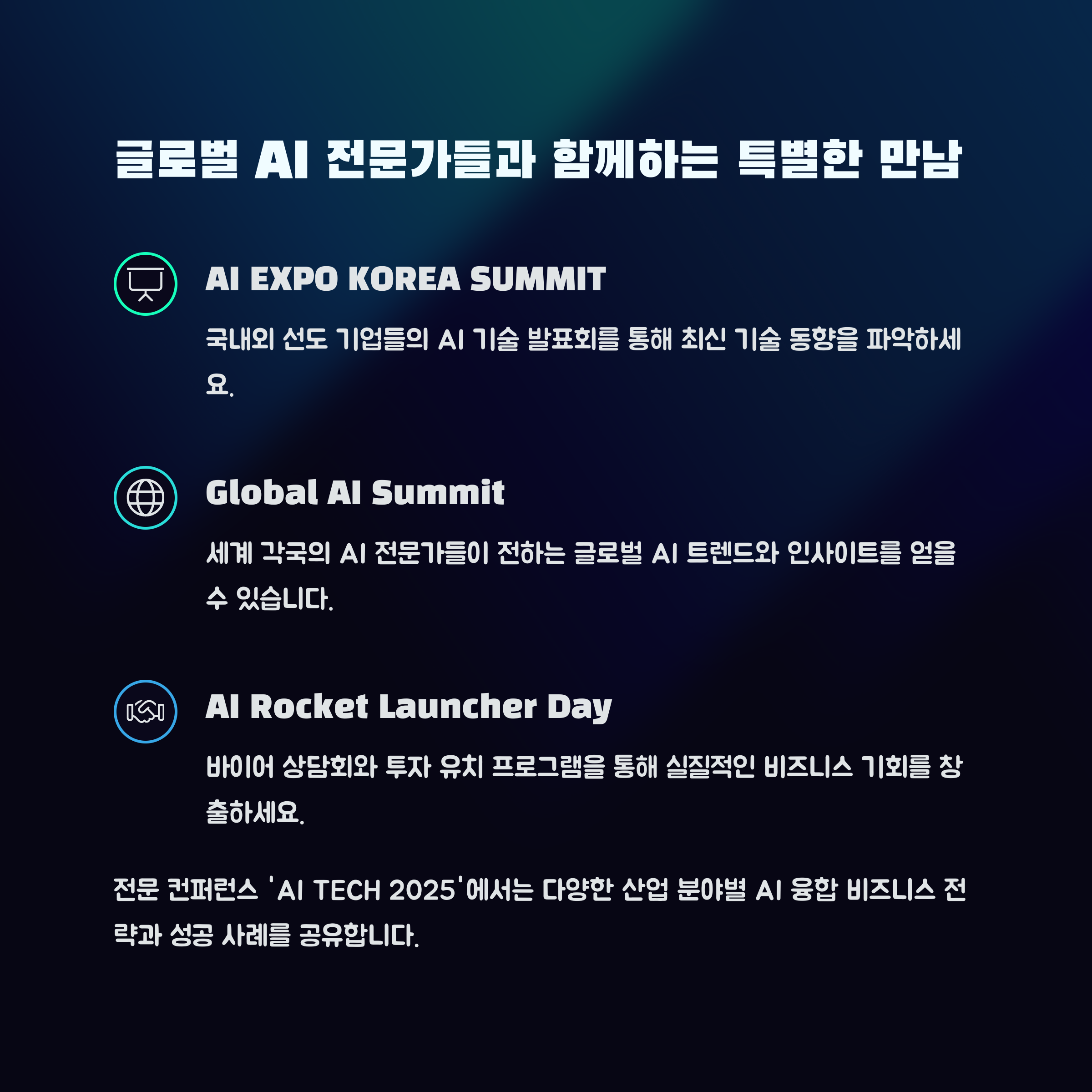 | AI 컨퍼런스 & 세미나 | 주제별 산업 리더 강연, 기술 트렌드 발표, 무료 청강 가능 |