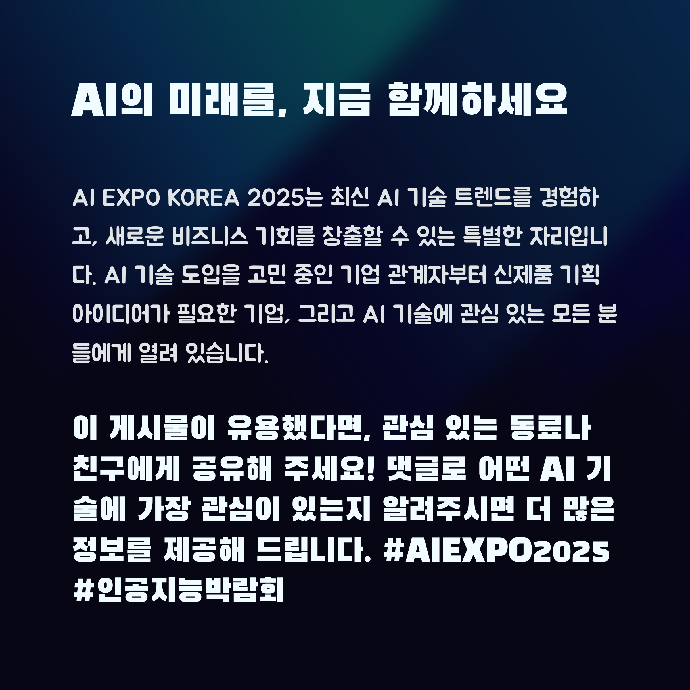 매년 AI 박람회를 다녀오면 “아, 이게 정말 현실이 되는구나!” 하고 놀라곤 했어요. 기술이라는 게 이렇게 우리 생활 속으로 깊이 들어와 있다는 걸, 현장에서 느낄 수 있다는 건 꽤 감동적인 경험입니다. 이번 AI EXPO KOREA 2025도 분명 그런 놀라움을 줄 것 같아요. 신기술에 관심 있는 분들이라면, 5월 코엑스에서 한 번쯤 발걸음을 옮겨보시길 추천드립니다. 미래는 이미 시작됐고, 지금 그 문이 열리고 있으니까요.