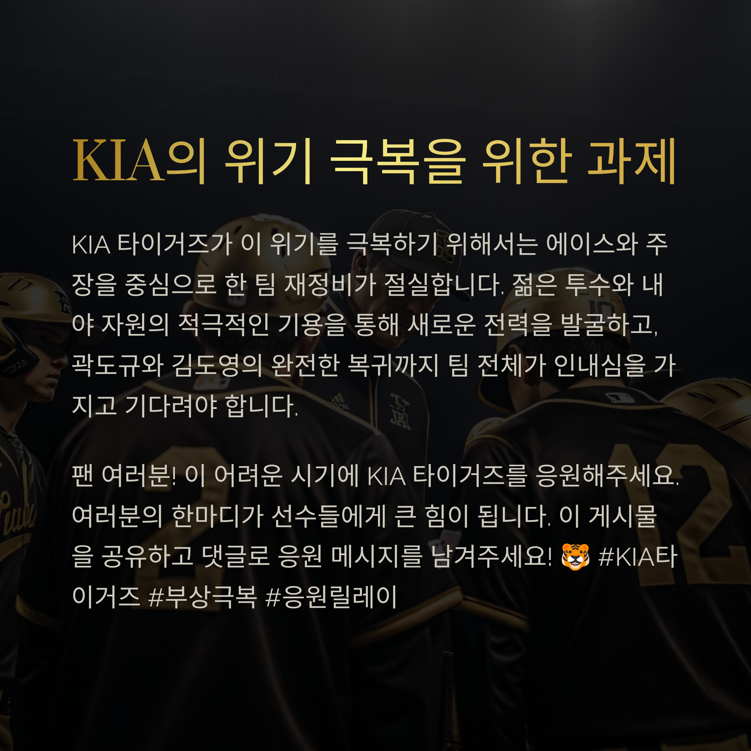 팬들에게는 아쉬운 소식이지만, 선수의 건강이 가장 우선이라는 점에서 이번 결정은 옳았습니다. 곽도규 선수가 건강하게 복귀하길, 김도영과 김선빈도 하루빨리 1군에서 다시 볼 수 있기를 기대해봅니다.