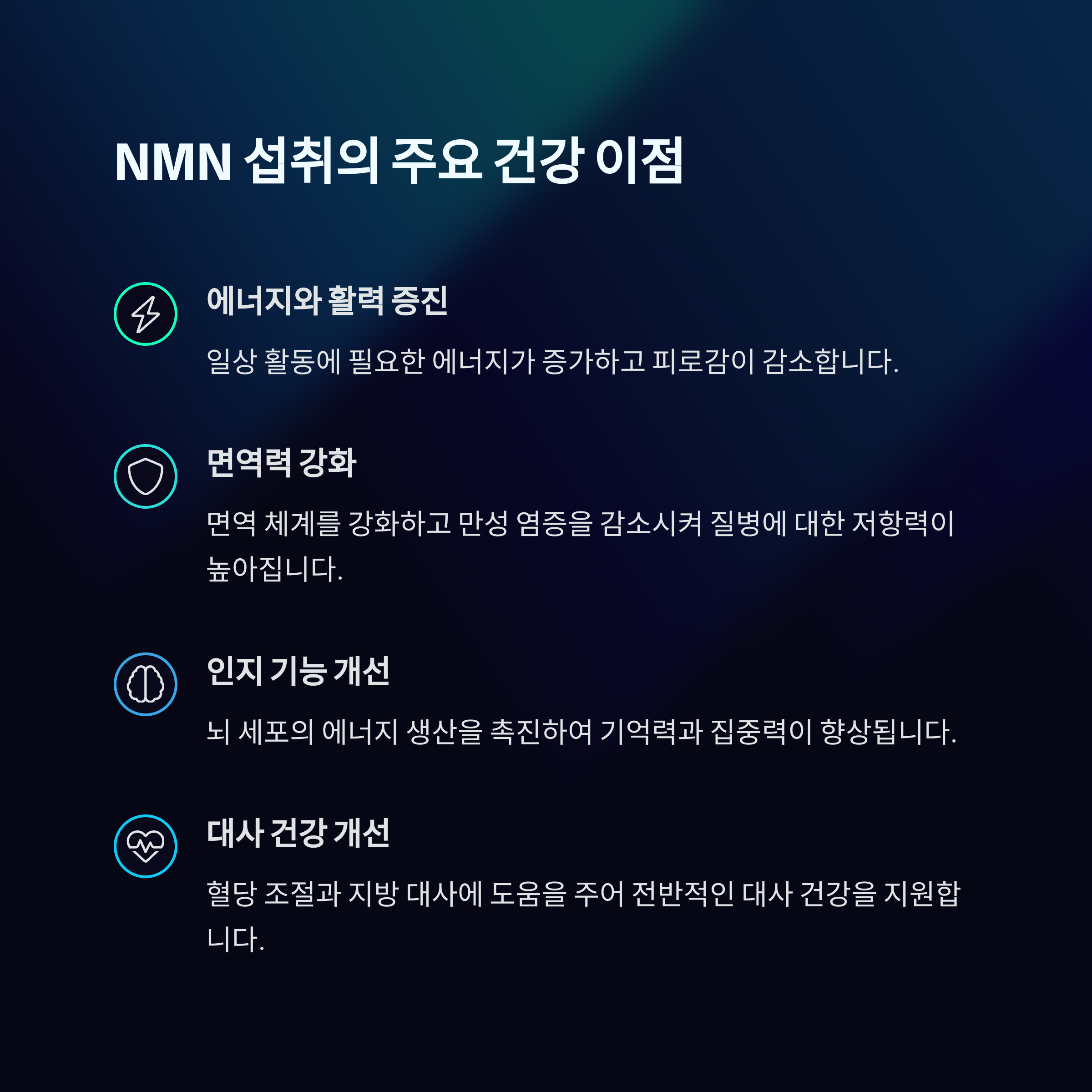 | 세포 에너지 활성화 | NAD+ 생성 증가로 세포 대사 촉진 |