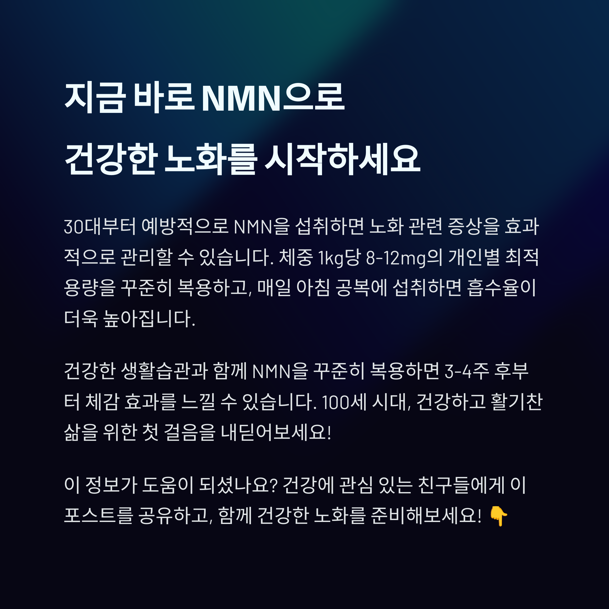 최근 NMN을 꾸준히 섭취하면서 느낀 건, 정말 작은 변화가 일상 전체를 다르게 만든다는 거예요. 아침에 일어났을 때의 개운함, 하루를 살아가는 에너지, 그리고 피부 컨디션까지 눈에 띄게 좋아지니까 자신감도 덩달아 올라가더라고요. NMN은 단순히 '젊어지고 싶다'는 욕구를 넘어서, 스스로를 건강하게 가꾸고 싶은 모든 분께 꼭 추천하고 싶습니다. 우리 함께 더 건강하고 빛나는 일상을 만들어봐요!