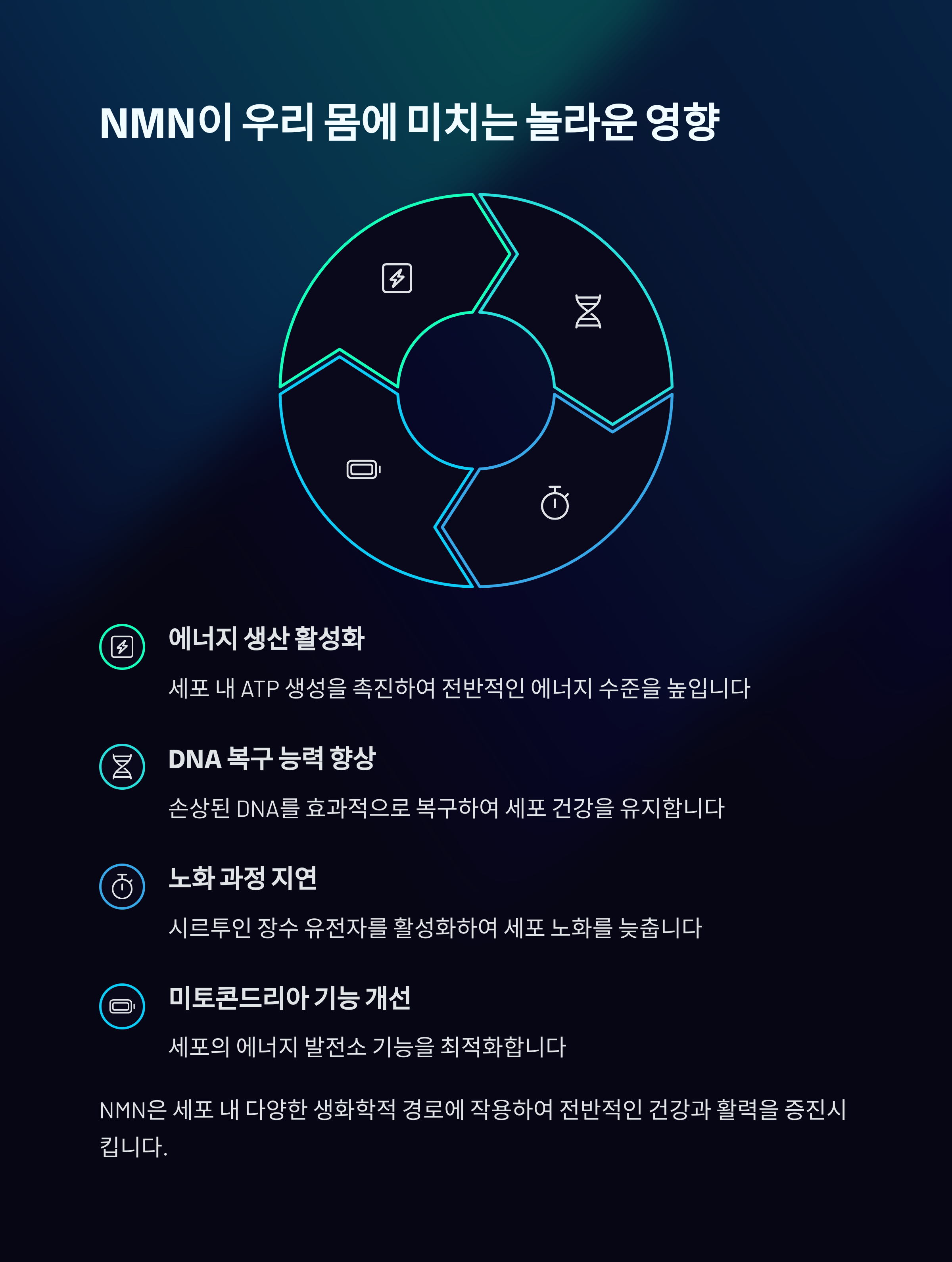 NMN(니코틴아미드 모노뉴클레오티드)은 우리 몸 안에서 에너지 생성에 필수적인 NAD+를 만드는 전구체입니다. NAD+는 세포의 에너지 대사, DNA 복구, 노화 방지에 핵심적인 역할을 하지만, 나이가 들수록 급격히 감소합니다. NMN을 섭취하면 NAD+ 수치를 끌어올려 활력과 젊음을 유지하는 데 도움을 줄 수 있습니다. 최근 다양한 연구 결과가 NMN의 항노화, 신진대사 개선 효과를 뒷받침하고 있어요.