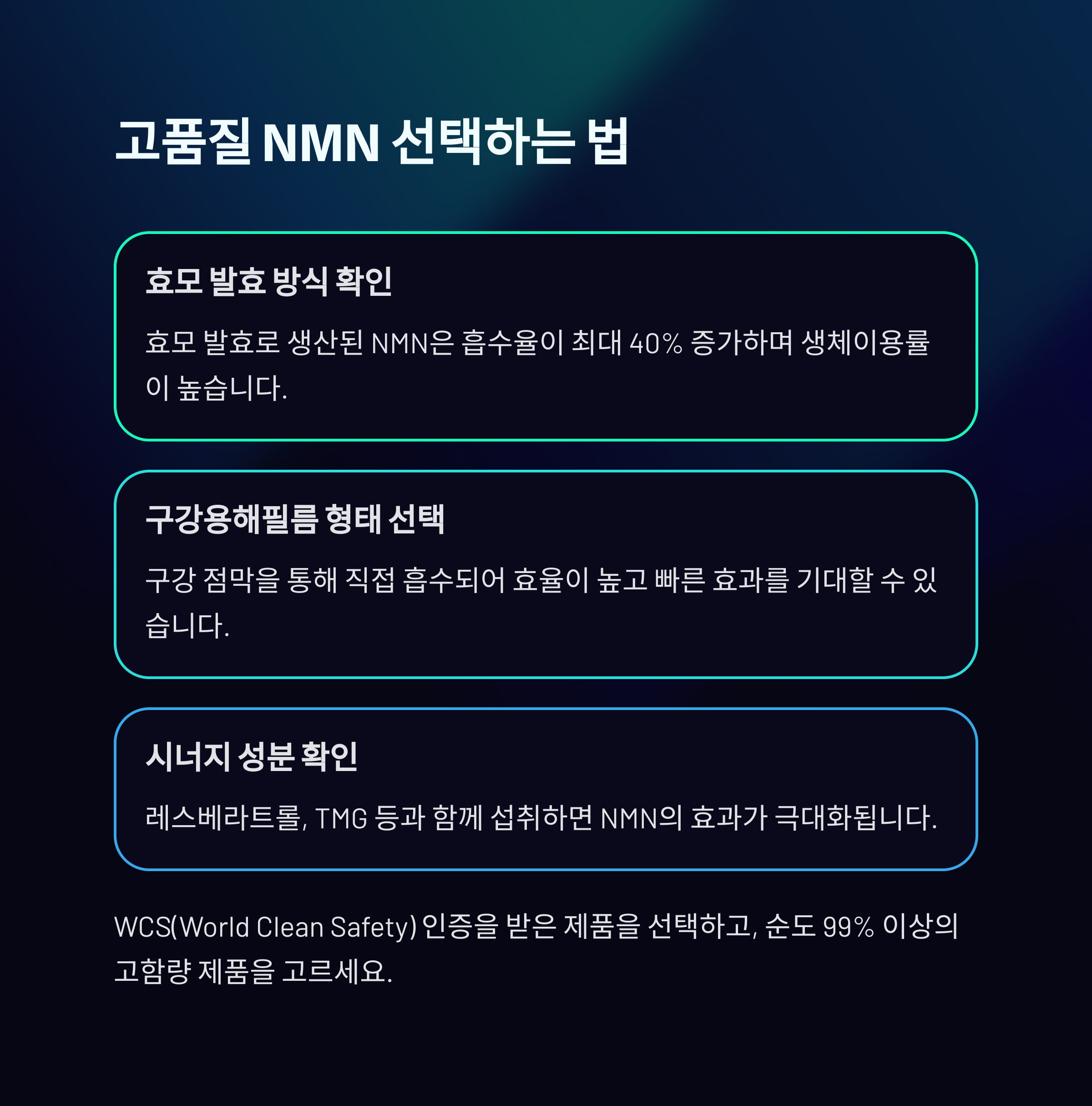 NMN 제품을 고를 때는 함량, 제조 방식, 흡수율 등을 꼼꼼히 따져야 합니다. 특히 효모 발효 방식으로 만들어진 NMN은 흡수율이 높고 안전성도 뛰어난 편입니다. 섭취는 아침 공복에 1~2회, 구강용해필름 제품의 경우 입안 점막에서 바로 흡수되어 효과를 극대화할 수 있어요. 꾸준히 섭취하면 에너지 향상, 피로 개선, 활력 회복 효과를 기대할 수 있습니다.