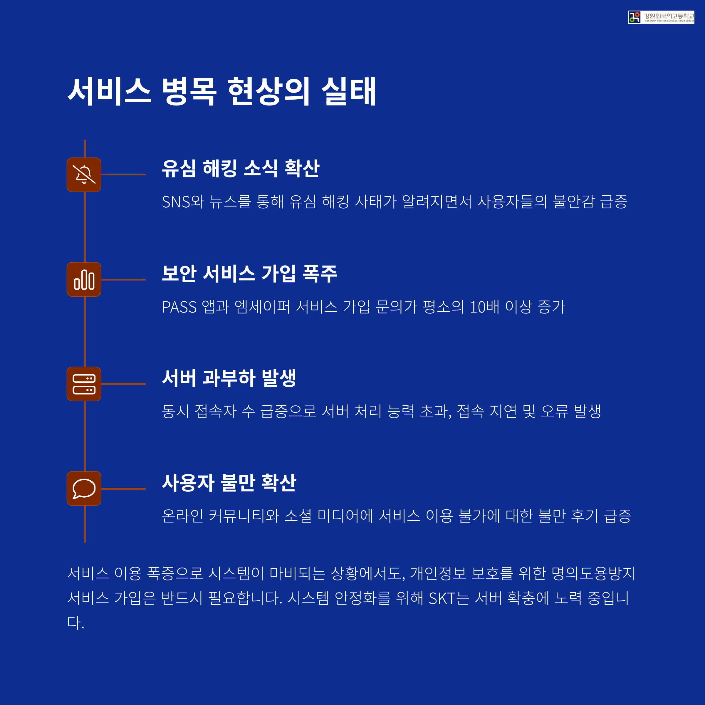 SKT 해킹 사건으로 인해 고객들의 명의 도용 우려가 급격히 증가했습니다. 이에 따라 수많은 이용자가 동시에 PASS와 엠세이퍼에 접속해 명의 도용 방지 서비스를 가입하려 하면서, 서버 트래픽이 폭발적으로 증가한 것이 주요 원인입니다. 즉, 단순한 시스템 오류가 아니라 '보안 공황'에 따른 트래픽 대란입니다.