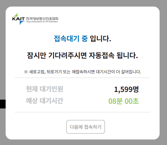 트래픽 폭주로 인해 지연되는 것이므로, 일정 시간 간격을 두고 재접속하거나 새벽 시간대를 노려 시도해보세요.