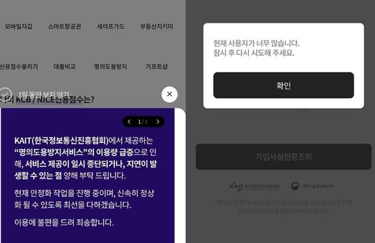 • PASS 앱에서 '명의 도용 방지 서비스' 가입 : 대기 시간이 길더라도 꾸준히 재접속 시도